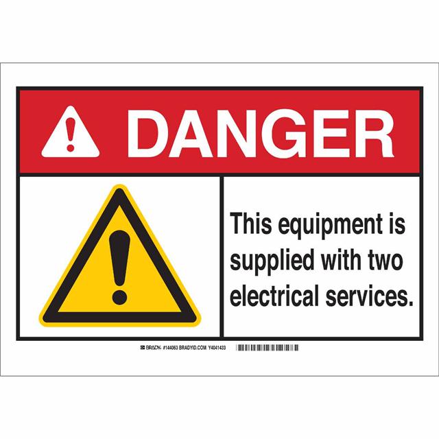 This is manufactured by Brady Corporation. The manufacturer part number is 144065. Label with a size of 14.00" l x 10.00" w (355.6mm x 254.0mm). The product is rohs3 compliant. It is assigned with possible HTSUS value of 3926.90.9985. It is shipped in bulk. It has a classic black and red legend, white background colour. The product brady®, is a highly preferred choice for users. The product is made from highly stable and reliable polyester. In addition, it is reach unaffected. Its typical moisture sensitivity level is not applicable. A bespoke label is a danger. this equipment is supplied with two electrical services label. It has a long 4 weeks standard lead time. The product is designated with the ear99 code number
