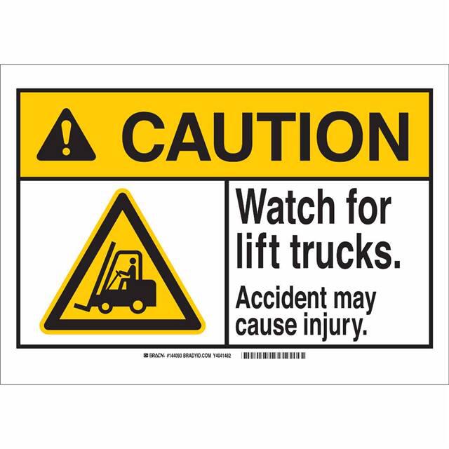 This is manufactured by Brady Corporation. The manufacturer part number is 144091. Label with a size of 10.00" l x 7.00" w (254.0mm x 177.8mm). The product is rohs3 compliant. It is assigned with possible HTSUS value of 3926.90.9985. It is shipped in bulk. It has a classic black and yellow legend, white background colour. The product brady®, is a highly preferred choice for users. The product is made from highly stable and reliable polyester. In addition, it is reach unaffected. Its typical moisture sensitivity level is not applicable. A bespoke label is a caution. watch for lift trucks. accident may cause injury label. The product is suitable for use with caution. It has a long 4 weeks standard lead time. The product is designated with the ear99 code number
