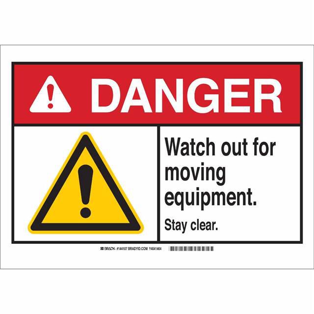 This is manufactured by Brady Corporation. The manufacturer part number is 144104. Label with a size of 10.00" l x 7.00" w (254.0mm x 177.8mm). The product is rohs3 compliant. It is assigned with possible HTSUS value of 8310.00.0000. It is shipped in bulk. It has a classic black, red and yellow legend, white background colour. The product brady®, is a highly preferred choice for users. The product is made from highly stable and reliable aluminum. In addition, it is reach unaffected. Its typical moisture sensitivity level is not applicable. A bespoke label is a danger. watch out for moving equipment stay clear label. The product is suitable for use with danger. It has a long 4 weeks standard lead time. The product is designated with the ear99 code number