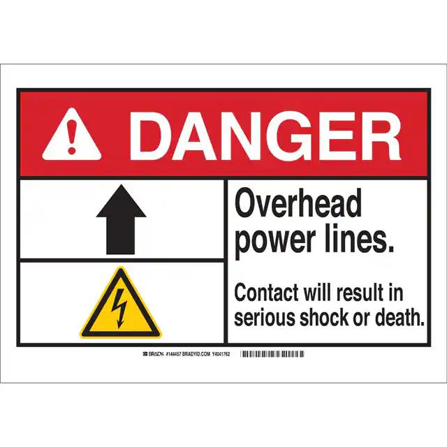 This is manufactured by Brady Corporation. The manufacturer part number is 144454. Label with a size of 10.00" l x 7.00" w (254.0mm x 177.8mm). The product is rohs3 compliant. It is assigned with possible HTSUS value of 8310.00.0000. It is shipped in bulk. It has a classic black, red and yellow legend, white background colour. The product brady®, is a highly preferred choice for users. The product is made from highly stable and reliable aluminum. In addition, it is reach unaffected. Its typical moisture sensitivity level is not applicable. A bespoke label is a danger. overhead power lines. contact will result in serious shock or death label. It has a long 4 weeks standard lead time. The product is designated with the ear99 code number
