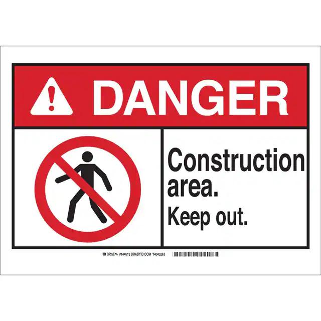 This is manufactured by Brady Corporation. The manufacturer part number is 144611. Label with a size of 10.00" l x 7.00" w (254.0mm x 177.8mm). The product is rohs3 compliant. It is assigned with possible HTSUS value of 8310.00.0000. It is shipped in bulk. It has a classic black and red legend, white background colour. The product brady®, is a highly preferred choice for users. The product is made from highly stable and reliable aluminum. In addition, it is reach unaffected. Its typical moisture sensitivity level is not applicable. A bespoke label is a danger. construction area. keep out label. The product is suitable for use with warning. It has a long 4 weeks standard lead time. The product is designated with the ear99 code number