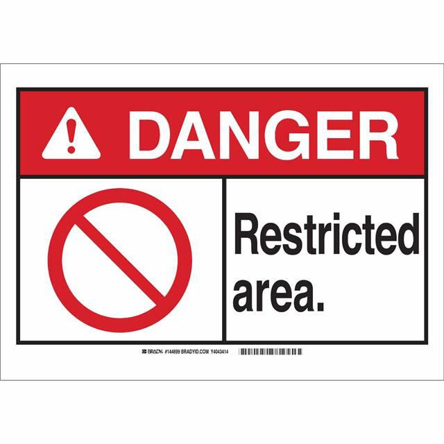 This is manufactured by Brady Corporation. The manufacturer part number is 144696. Label with a size of 10.00" l x 7.00" w (254.0mm x 177.8mm). The product is rohs3 compliant. It is assigned with possible HTSUS value of 3926.90.9985. It is shipped in bulk. It has a classic black and red legend, white background colour. The product brady®, is a highly preferred choice for users. The product is made from highly stable and reliable polyester. In addition, it is reach unaffected. Its typical moisture sensitivity level is not applicable. A bespoke label is a danger. restricted area label. The product is suitable for use with danger. It has a long 4 weeks standard lead time. The product is designated with the ear99 code number