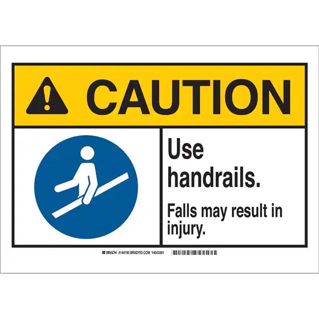 This is manufactured by Brady Corporation. The manufacturer part number is 144789. Label with a size of 10.00" l x 7.00" w (254.0mm x 177.8mm). The product is rohs3 compliant. It is assigned with possible HTSUS value of 3926.90.9985. It is shipped in bulk. It has a classic black, blue and yellow legend, white background colour. The product brady®, is a highly preferred choice for users. The product is made from highly stable and reliable polyester. In addition, it is reach unaffected. Its typical moisture sensitivity level is not applicable. A bespoke label is a caution. use handrail falls may result in injury label. The product is suitable for use with caution. It has a long 4 weeks standard lead time. The product is designated with the ear99 code number