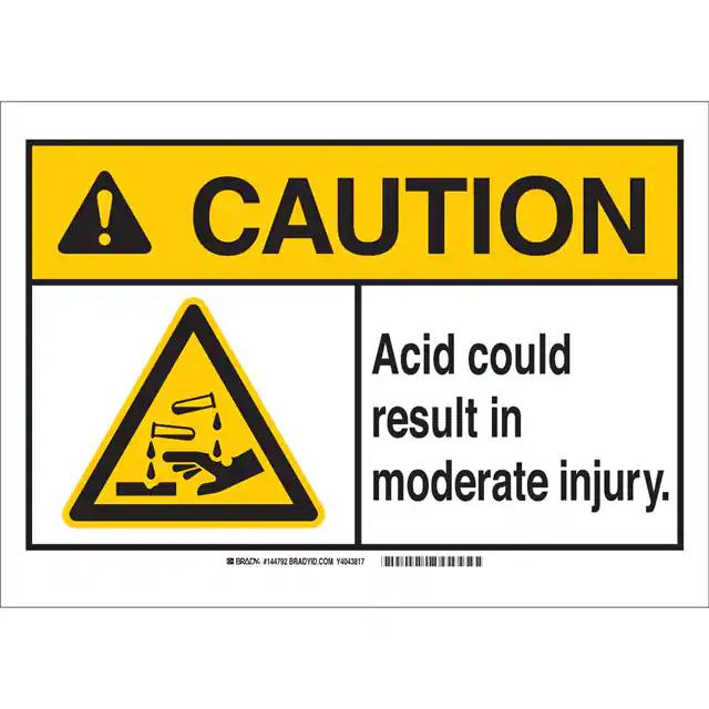 This is manufactured by Brady Corporation. The manufacturer part number is 144793. Label with a size of 10.00" l x 7.00" w (254.0mm x 177.8mm). The product is rohs3 compliant. It is assigned with possible HTSUS value of 3926.90.9985. It is shipped in bulk. It has a classic black and yellow legend, white background colour. The product brady®, is a highly preferred choice for users. The product is made from highly stable and reliable polyester. In addition, it is reach unaffected. Its typical moisture sensitivity level is not applicable. A bespoke label is a caution. acid. could result in moderate injury label. The product is suitable for use with caution. It has a long 4 weeks standard lead time. The product is designated with the ear99 code number