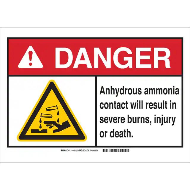This is manufactured by Brady Corporation. The manufacturer part number is 144813. Label with a size of 10.00" l x 7.00" w (254.0mm x 177.8mm). The product is rohs3 compliant. It is assigned with possible HTSUS value of 3926.90.9985. It is shipped in bulk. It has a classic black, red and yellow legend, white background colour. The product brady®, is a highly preferred choice for users. The product is made from highly stable and reliable polyester. In addition, it is reach unaffected. Its typical moisture sensitivity level is not applicable. A bespoke label is a anhydrous ammonia. contact will result in severe burns, injury or death label. The product is suitable for use with notice. It has a long 4 weeks standard lead time. The product is designated with the ear99 code number