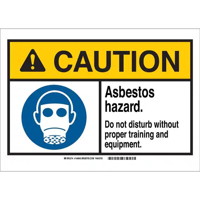 This is manufactured by Brady Corporation. The manufacturer part number is 144842. Label with a size of 10.00" l x 7.00" w (254.0mm x 177.8mm). The product is rohs3 compliant. It is assigned with possible HTSUS value of 8310.00.0000. It is shipped in bulk. It has a classic black and yellow legend, white background colour. The product brady®, is a highly preferred choice for users. The product is made from highly stable and reliable aluminum. In addition, it is reach unaffected. Its typical moisture sensitivity level is not applicable. A bespoke label is a caution. asbestos. hazardous. do not disturb without proper training and equipment label. It has a long 4 weeks standard lead time. The product is designated with the ear99 code number