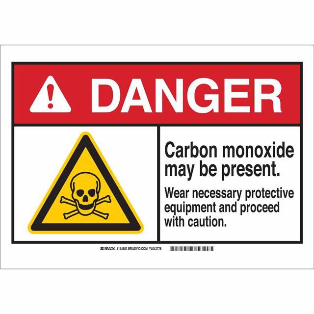 This is manufactured by Brady Corporation. The manufacturer part number is 144854. Label with a size of 10.00" l x 7.00" w (254.0mm x 177.8mm). The product is rohs3 compliant. It is assigned with possible HTSUS value of 3926.90.9985. It is shipped in bulk. It has a classic black, red and yellow legend, white background colour. The product brady®, is a highly preferred choice for users. The product is made from highly stable and reliable polyester. In addition, it is reach unaffected. Its typical moisture sensitivity level is not applicable. A bespoke label is a danger. carbon monoxide may be present. wear necessary protective equipment and proceed with caution label. The product is suitable for use with caution. It has a long 4 weeks standard lead time. The product is designated with the ear99 code number