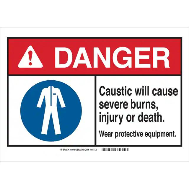 This is manufactured by Brady Corporation. The manufacturer part number is 144871. Label with a size of 10.00" l x 7.00" w (254.0mm x 177.8mm). The product is rohs3 compliant. It is assigned with possible HTSUS value of 3926.90.9985. It is shipped in bulk. It has a classic black, blue and red legend, white background colour. The product brady®, is a highly preferred choice for users. The product is made from highly stable and reliable polyester. In addition, it is reach unaffected. Its typical moisture sensitivity level is not applicable. A bespoke label is a caustic. will cause severe burns, injury or death. wear protective equipment label. The product is suitable for use with warning. It has a long 4 weeks standard lead time. The product is designated with the ear99 code number