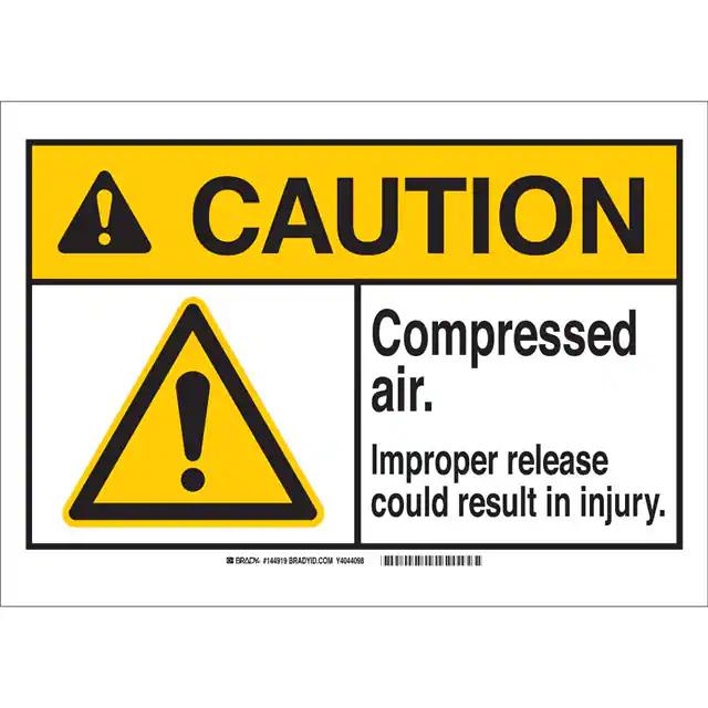 This is manufactured by Brady Corporation. The manufacturer part number is 144918. Label with a size of 10.00" l x 7.00" w (254.0mm x 177.8mm). The product is rohs3 compliant. It is assigned with possible HTSUS value of 3926.90.9985. It is shipped in bulk. It has a classic black and yellow legend, white background colour. The product brady®, is a highly preferred choice for users. The product is made from highly stable and reliable polyester. In addition, it is reach unaffected. Its typical moisture sensitivity level is not applicable. A bespoke label is a caution. compressed air. improper release could result in injury label. It has a long 4 weeks standard lead time. The product is designated with the ear99 code number