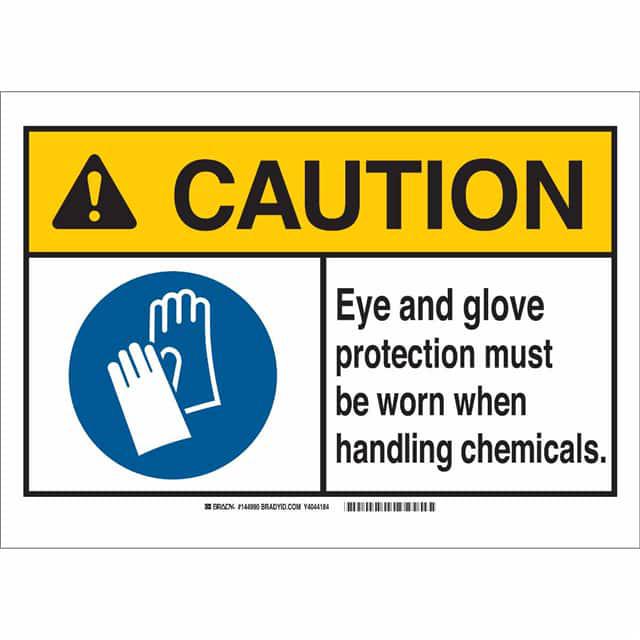 This is manufactured by Brady Corporation. The manufacturer part number is 144988. Label with a size of 14.00" l x 10.00" w (355.6mm x 254.0mm). The product is rohs3 compliant. It is assigned with possible HTSUS value of 3926.90.9985. It is shipped in bulk. It has a classic black, blue and yellow legend, white background colour. The product brady®, is a highly preferred choice for users. The product is made from highly stable and reliable polyester. In addition, it is reach unaffected. Its typical moisture sensitivity level is not applicable. A bespoke label is a caution. eye and glove protection must be worn when handling chemicals label. It has a long 4 weeks standard lead time. The product is designated with the ear99 code number