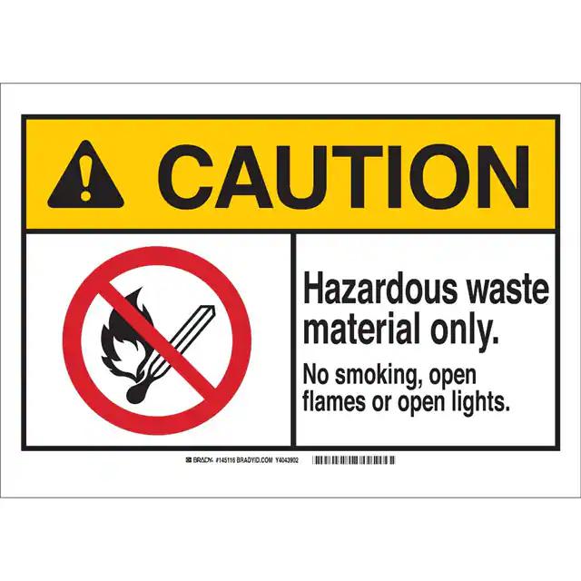 This is manufactured by Brady Corporation. The manufacturer part number is 145119. Label with a size of 14.00" l x 10.00" w (355.6mm x 254.0mm). The product is rohs3 compliant. It is assigned with possible HTSUS value of 3926.90.9985. It is shipped in bulk. It has a classic black, red and yellow legend, white background colour. The product brady®, is a highly preferred choice for users. The product is made from highly stable and reliable polyester. In addition, it is reach unaffected. Its typical moisture sensitivity level is not applicable. A bespoke label is a caution. hazardous waste material storage only. no smoking, open flames or open lights label. The product is suitable for use with caution. It has a long 4 weeks standard lead time. The product is designated with the ear99 code number