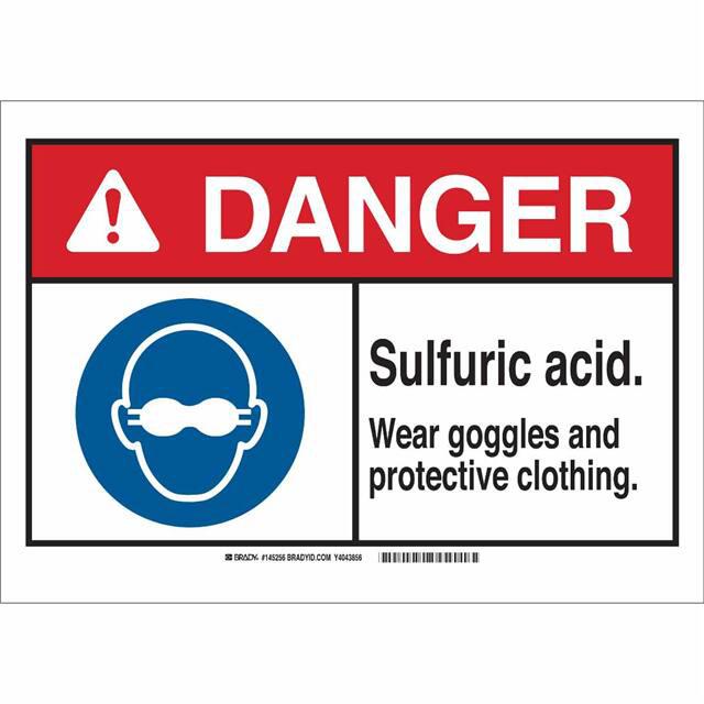 This is manufactured by Brady Corporation. The manufacturer part number is 145259. Label with a size of 10.00" l x 7.00" w (254.0mm x 177.8mm). The product is rohs3 compliant. It is assigned with possible HTSUS value of 8310.00.0000. It is shipped in bulk. It has a classic black, blue and red legend, white background colour. The product brady®, is a highly preferred choice for users. The product is made from highly stable and reliable aluminum. In addition, it is reach unaffected. Its typical moisture sensitivity level is not applicable. A bespoke label is a danger. sulfuric acid. wear goggles and protective clothing label. The product is suitable for use with warning. It has a long 4 weeks standard lead time. The product is designated with the ear99 code number