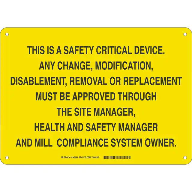 This is manufactured by Brady Corporation. The manufacturer part number is 145590. Label with a size of 12.00" l x 9.00" w (304.8mm x 228.6mm). The product is rohs3 compliant. It is assigned with possible HTSUS value of 3926.90.9985. It is shipped in bulk. It has a classic black legend, yellow background colour. The product brady®, is a highly preferred choice for users. The product is made from highly stable and reliable polyester. In addition, it is reach unaffected. Its typical moisture sensitivity level is not applicable. A bespoke label is a this is a safety critical device. any change, modification, disablement, removal or replacement must be approved through the s… label. It has a long 4 weeks standard lead time. The product is designated with the ear99 code number