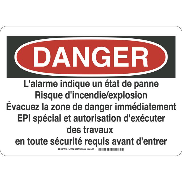 This is manufactured by Brady Corporation. The manufacturer part number is 145680. Label with a size of 14.00" l x 10.00" w (355.6mm x 254.0mm). The product is rohs3 compliant. It is assigned with possible HTSUS value of 3926.90.9985. It is shipped in bulk. It has a classic black and red legend, white background colour. The product brady®, is a highly preferred choice for users. The product is made from highly stable and reliable polyester. In addition, it is reach unaffected. Its typical moisture sensitivity level is not applicable. A bespoke label is a danger. l'alarme indique un état de panne risque d'incendie. explosion évacuez la zone de danger immédiatement epi spécial et … label. The product is suitable for use with danger. It has a long 4 weeks standard lead time. The product is designated with the ear99 code number