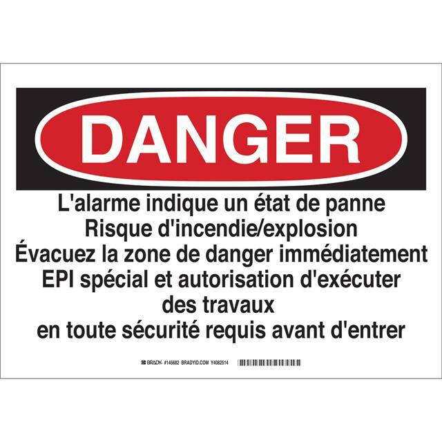 This is manufactured by Brady Corporation. The manufacturer part number is 145682. Label with a size of 14.00" l x 10.00" w (355.6mm x 254.0mm). The product is rohs3 compliant. It is assigned with possible HTSUS value of 3926.90.9985. It is shipped in bulk. It has a classic black and red legend, white background colour. The product brady®, is a highly preferred choice for users. The product is made from highly stable and reliable polyester. In addition, it is reach unaffected. Its typical moisture sensitivity level is not applicable. A bespoke label is a l'alarme indique un état de panne risque d'incendie. explosion évacuez la zone de danger immédiatement epi spécial et autorisa… label. The product is suitable for use with danger. It has a long 4 weeks standard lead time. The product is designated with the ear99 code number