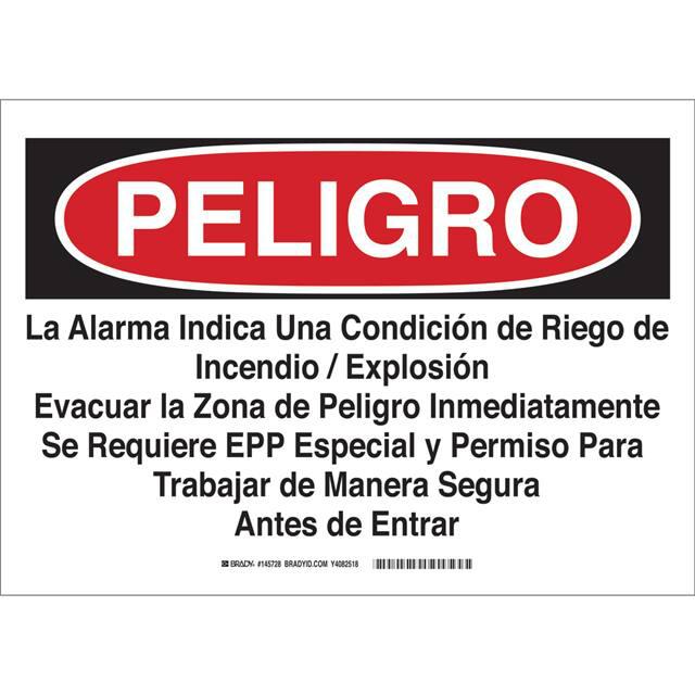 This is manufactured by Brady Corporation. The manufacturer part number is 145728. Label with a size of 14.00" l x 10.00" w (355.6mm x 254.0mm). The product is rohs3 compliant. It is assigned with possible HTSUS value of 3926.90.9985. It is shipped in bulk. It has a classic black and red legend, white background colour. The product brady®, is a highly preferred choice for users. The product is made from highly stable and reliable polyester. In addition, it is reach unaffected. Its typical moisture sensitivity level is not applicable. A bespoke label is a peligro. la alarma indica una condicion de riego de incendio/explosion evacuar la zona d label. The product is suitable for use with danger. It has a long 4 weeks standard lead time. The product is designated with the ear99 code number