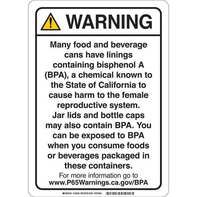 This is manufactured by Brady Corporation. The manufacturer part number is 150452. Label with a size of 10.00" l x 7.00" w (254.0mm x 177.8mm). The product is rohs3 compliant. It is assigned with possible HTSUS value of 3926.90.9985. It is shipped in bulk. It has a classic black legend, white background colour. The product brady®, is a highly preferred choice for users. The product is made from highly stable and reliable polyester. In addition, it is reach unaffected. Its typical moisture sensitivity level is not applicable. A bespoke label is a warning. many food and beverage cans have linings containing bisphenol a (bpa), a chemical known to the state of california to… label. The product is suitable for use with warning. It has a long 4 weeks standard lead time. The product is designated with the ear99 code number