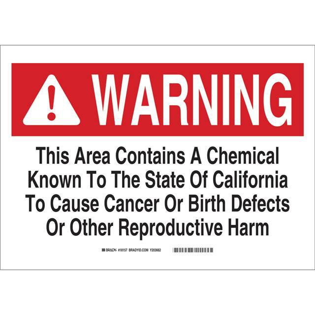This is manufactured by Brady Corporation. The manufacturer part number is 18159. Label with a size of 14.00" l x 10.00" w (355.6mm x 254.0mm). The product is rohs3 compliant. It is assigned with possible HTSUS value of 3926.90.9985. It is shipped in bulk. It has a classic black and red legend, white background colour. The product brady®, is a highly preferred choice for users. The product is made from highly stable and reliable polyester. In addition, it is reach unaffected. Its typical moisture sensitivity level is not applicable. A bespoke label is a warning. this area contains a chemical known to the state of california to cause cancer or birth defects or other reproductive… label. The product is suitable for use with warning. It has a long 4 weeks standard lead time. The product is designated with the ear99 code number