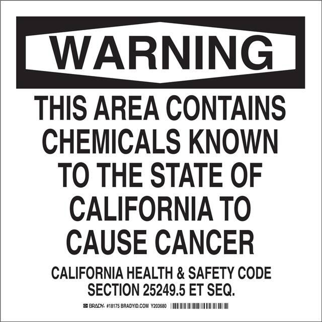 This is manufactured by Brady Corporation. The manufacturer part number is 18175. Label with a size of 14.00" l x 10.00" w (355.6mm x 254.0mm). The product is rohs3 compliant. It is assigned with possible HTSUS value of 3926.90.9985. It is shipped in bulk. It has a classic black legend, white background colour. The product brady®, is a highly preferred choice for users. The product is made from highly stable and reliable polyester. In addition, it is reach unaffected. Its typical moisture sensitivity level is not applicable. A bespoke label is a warning. this area contains chemicals known to the state of california to cause cancer label. The product is suitable for use with warning. It has a long 4 weeks standard lead time. The product is designated with the ear99 code number