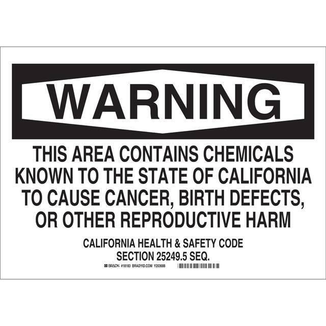 This is manufactured by Brady Corporation. The manufacturer part number is 18182. Label with a size of 14.00" l x 10.00" w (355.6mm x 254.0mm). The product is rohs3 compliant. It is assigned with possible HTSUS value of 3926.90.9985. It is shipped in bulk. It has a classic black legend, white background colour. The product brady®, is a highly preferred choice for users. The product is made from highly stable and reliable polyethylene. In addition, it is reach unaffected. Its typical moisture sensitivity level is not applicable. A bespoke label is a warning. this area contains chemicals known to the state of california to cause cancer, birth defects, or other reproductive h… label. The product is suitable for use with warning. It has a long 4 weeks standard lead time. The product is designated with the ear99 code number