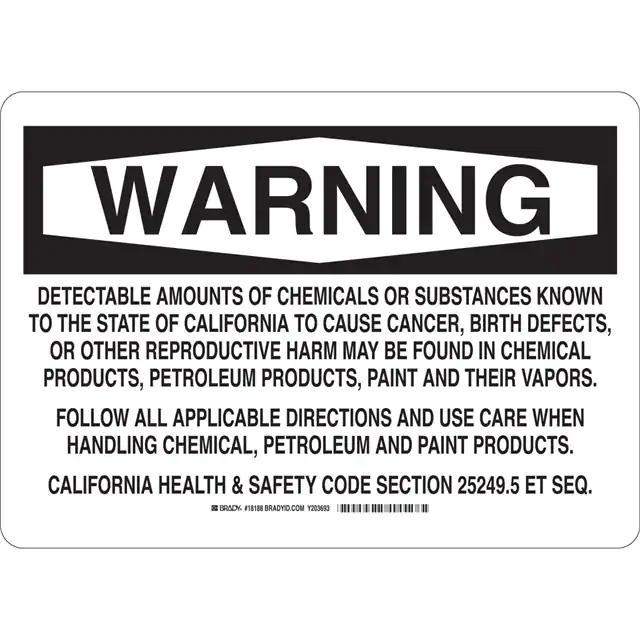 This is manufactured by Brady Corporation. The manufacturer part number is 18189. Label with a size of 14.00" l x 10.00" w (355.6mm x 254.0mm). The product is rohs3 compliant. It is assigned with possible HTSUS value of 3926.90.9985. It is shipped in bulk. It has a classic black legend, white background colour. The product brady®, is a highly preferred choice for users. The product is made from highly stable and reliable polyester. In addition, it is reach unaffected. Its typical moisture sensitivity level is not applicable. A bespoke label is a warning. detectable amounts of chemicals or substances known to the state of california to cause cancer, birth defects, or oth… label. The product is suitable for use with warning. It has a long 4 weeks standard lead time. The product is designated with the ear99 code number