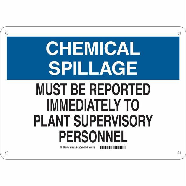 This is manufactured by Brady Corporation. The manufacturer part number is 18252. Label with a size of 14.00" l x 10.00" w (355.6mm x 254.0mm). The product is rohs3 compliant. It is assigned with possible HTSUS value of 3926.90.9985. It is shipped in bulk. It has a classic black and blue legend, white background colour. The product brady®, is a highly preferred choice for users. The product is made from highly stable and reliable polyester. In addition, it is reach unaffected. Its typical moisture sensitivity level is not applicable. A bespoke label is a chemical spillage. must be reported immediately to plant supervisory personnel label. The product is suitable for use with warning. It has a long 4 weeks standard lead time. The product is designated with the ear99 code number