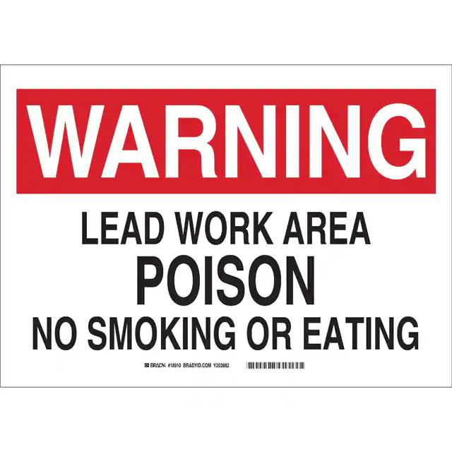 This is manufactured by Brady Corporation. The manufacturer part number is 18910. Label with a size of 14.00" l x 10.00" w (355.6mm x 254.0mm). The product is rohs3 compliant. It is assigned with possible HTSUS value of 3926.90.9985. It is shipped in bulk. It has a classic black and red legend, white background colour. The product brady®, is a highly preferred choice for users. The product is made from highly stable and reliable polyester. In addition, it is reach unaffected. Its typical moisture sensitivity level is not applicable. A bespoke label is a warning. lead work area poison no smoking or eating label. The product is suitable for use with warning. It has a long 4 weeks standard lead time. The product is designated with the ear99 code number