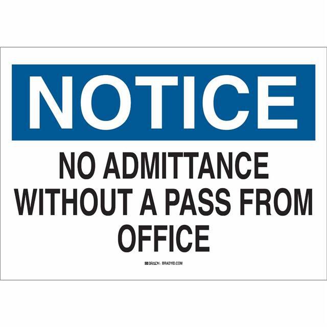 This is manufactured by Brady Corporation. The manufacturer part number is 22156. Label with a size of 14.00" l x 10.00" w (355.6mm x 254.0mm). The product is rohs3 compliant. It is assigned with possible HTSUS value of 3926.90.9985. It is shipped in bulk. It has a classic black and blue legend, white background colour. The product brady®, is a highly preferred choice for users. The product is made from highly stable and reliable polyester. In addition, it is reach unaffected. Its typical moisture sensitivity level is not applicable. A bespoke label is a notice. no admittance without a pass from office label. The product is suitable for use with notice. It has a long 4 weeks standard lead time. The product is designated with the ear99 code number