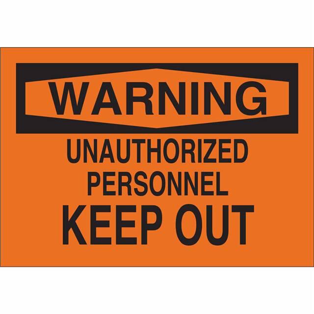 This is manufactured by Brady Corporation. The manufacturer part number is 22206. Label with a size of 14.00" l x 10.00" w (355.6mm x 254.0mm). The product is rohs3 compliant. It is assigned with possible HTSUS value of 3926.90.9985. It is shipped in bulk. It has a classic black legend, orange background colour. The product brady®, is a highly preferred choice for users. The product is made from highly stable and reliable polyester. In addition, it is reach unaffected. Its typical moisture sensitivity level is not applicable. A bespoke label is a warning. unauthorized personnel keep out label. The product is suitable for use with warning. It has a long 4 weeks standard lead time. The product is designated with the ear99 code number