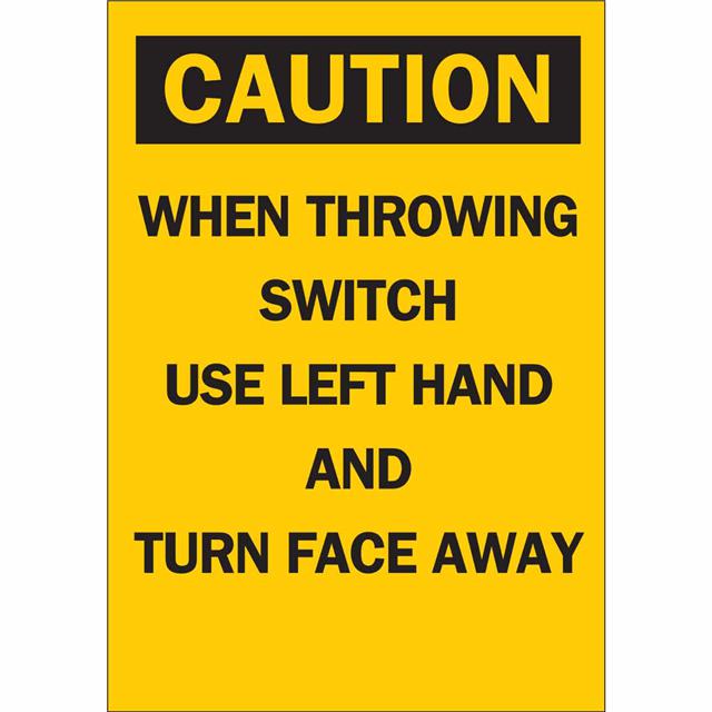 This is manufactured by Brady Corporation. The manufacturer part number is 22943. Label with a size of 10.00" l x 7.00" w (254.0mm x 177.8mm). The product is rohs3 compliant. It is assigned with possible HTSUS value of 3926.90.9985. It is shipped in bulk. It has a classic black legend, yellow background colour. The product brady®, is a highly preferred choice for users. The product is made from highly stable and reliable polyester. In addition, it is reach unaffected. Its typical moisture sensitivity level is not applicable. A bespoke label is a caution. when throwing switch use left hand and turn face away label. The product is suitable for use with caution. It has a long 4 weeks standard lead time. The product is designated with the ear99 code number