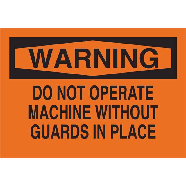 This is manufactured by Brady Corporation. The manufacturer part number is 25026. Label with a size of 14.00" l x 10.00" w (355.6mm x 254.0mm). The product is rohs3 compliant. It is assigned with possible HTSUS value of 3926.90.9985. It is shipped in bulk. It has a classic black legend, orange background colour. The product brady®, is a highly preferred choice for users. The product is made from highly stable and reliable polyester. In addition, it is reach unaffected. Its typical moisture sensitivity level is not applicable. A bespoke label is a warning. do not operate machine without guards in place label. The product is suitable for use with warning. It has a long 4 weeks standard lead time. The product is designated with the ear99 code number