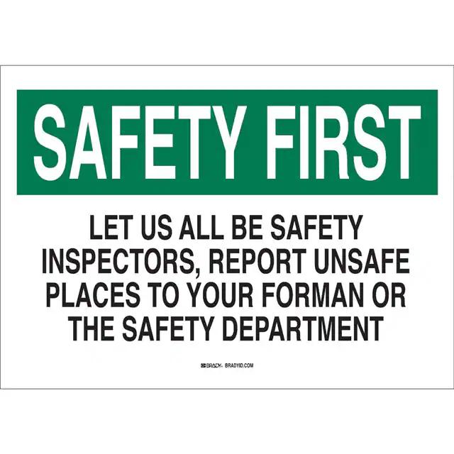 This is manufactured by Brady Corporation. The manufacturer part number is 25317. Label with a size of 10.00" l x 7.00" w (254.0mm x 177.8mm). The product is rohs3 compliant. It is assigned with possible HTSUS value of 3926.90.9985. It is shipped in bulk. It has a classic black and green legend, white background colour. The product brady®, is a highly preferred choice for users. The product is made from highly stable and reliable polyester. In addition, it is reach unaffected. Its typical moisture sensitivity level is not applicable. A bespoke label is a safety first. let us all be safety inspectors, report unsafe places to your foreman or the safety department label. The product is suitable for use with safety. It has a long 4 weeks standard lead time. The product is designated with the ear99 code number