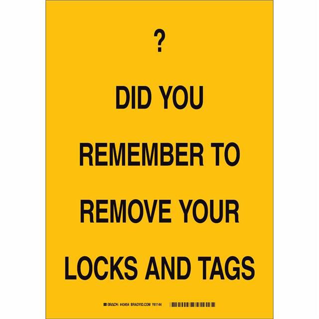 This is manufactured by Brady Corporation. The manufacturer part number is 25877. Label with a size of 14.00" l x 10.00" w (355.6mm x 254.0mm). The product is rohs3 compliant. It is assigned with possible HTSUS value of 3926.90.9985. It is shipped in bulk. It has a classic black legend, yellow background colour. The product brady®, is a highly preferred choice for users. The product is made from highly stable and reliable polyester. In addition, it is reach unaffected. Its typical moisture sensitivity level is not applicable. A bespoke label is a did you remember to remove your locks and tags label. The product is suitable for use with warning. It has a long 4 weeks standard lead time. The product is designated with the ear99 code number
