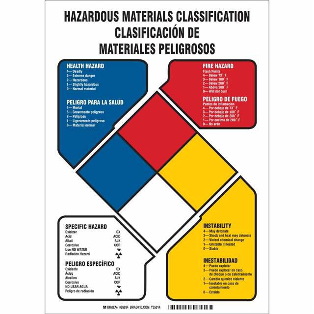 This is manufactured by Brady Corporation. The manufacturer part number is 26634. Label with a size of 14.00" l x 10.00" w (355.6mm x 254.0mm). The product is rohs3 compliant. It is assigned with possible HTSUS value of 3926.90.9985. It is shipped in bulk. It has a classic black, blue, red and yellow legend, white background colour. The product brady®, is a highly preferred choice for users. The product is made from highly stable and reliable polyester. In addition, it is reach unaffected. Its typical moisture sensitivity level is not applicable. A bespoke label is a hazardous materials classification/clasificacion de materiales peligrosos label. The product is suitable for use with danger. It has a long 4 weeks standard lead time. The product is designated with the ear99 code number