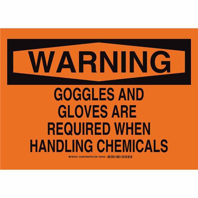 This is manufactured by Brady Corporation. The manufacturer part number is 34386. Label with a size of 14.00" l x 10.00" w (355.6mm x 254.0mm). The product is not applicable. It is assigned with possible HTSUS value of 3926.90.9985. It is shipped in bulk. It has a classic black legend, orange background colour. The product brady®, is a highly preferred choice for users. The product is made from highly stable and reliable polyester. In addition, it is reach unaffected. Its typical moisture sensitivity level is not applicable. A bespoke label is a warning. goggles and gloves are required when handling chemicals label. The product is suitable for use with warning. It has a long 4 weeks standard lead time. The product is designated with the ear99 code number