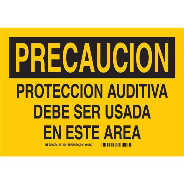 This is manufactured by Brady Corporation. The manufacturer part number is 37694. Label with a size of 10.00" l x 7.00" w (254.0mm x 177.8mm). The product is rohs3 compliant. It is assigned with possible HTSUS value of 3926.90.9985. It is shipped in bulk. It has a classic black legend, yellow background colour. The product brady®, is a highly preferred choice for users. The product is made from highly stable and reliable polyester. In addition, it is reach unaffected. Its typical moisture sensitivity level is not applicable. A bespoke label is a precaucion. proteccion auditiva debe ser usada en este area label. The product is suitable for use with caution. It has a long 4 weeks standard lead time. The product is designated with the ear99 code number