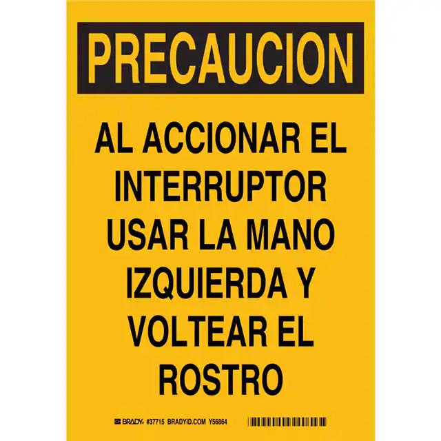 This is manufactured by Brady Corporation. The manufacturer part number is 37715. Label with a size of 10.00" l x 7.00" w (254.0mm x 177.8mm). The product is rohs3 compliant. It is assigned with possible HTSUS value of 4911.99.8000. It is shipped in bulk. It has a classic black legend, yellow background colour. The product brady®, is a highly preferred choice for users. The product is made from highly stable and reliable polyester. In addition, it is reach unaffected. Its typical moisture sensitivity level is not applicable. A bespoke label is a precaucion. al accionar el interruptor usar la mano izquierda y voltear el rostro label. The product is suitable for use with warning. It has a long 4 weeks standard lead time. The product is designated with the ear99 code number