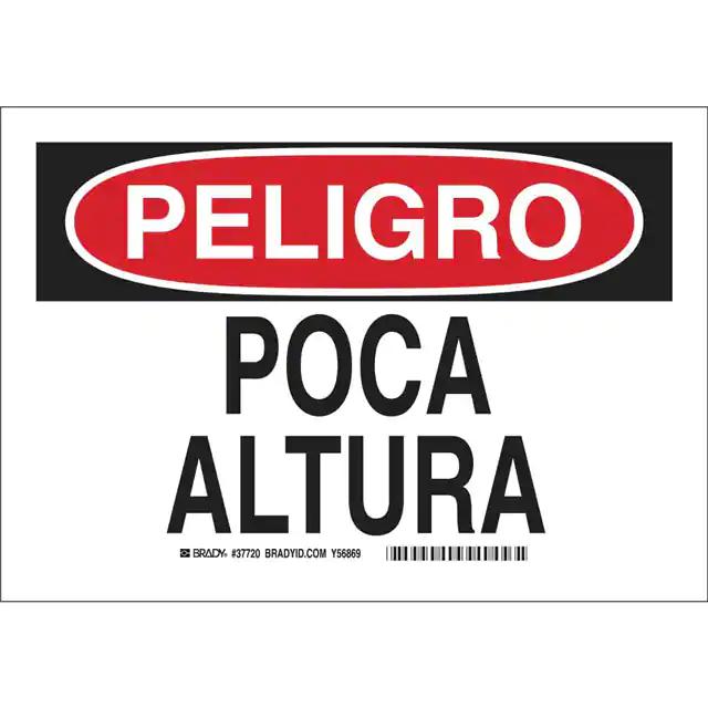 This is manufactured by Brady Corporation. The manufacturer part number is 37720. Label with a size of 10.00" l x 7.00" w (254.0mm x 177.8mm). The product is rohs3 compliant. It is assigned with possible HTSUS value of 3926.90.9985. It is shipped in bulk. It has a classic black and red legend, white background colour. The product brady®, is a highly preferred choice for users. The product is made from highly stable and reliable polyester. In addition, it is reach unaffected. Its typical moisture sensitivity level is not applicable. A bespoke label is a peligro. poca altura label. The product is suitable for use with danger. It has a long 4 weeks standard lead time. The product is designated with the ear99 code number