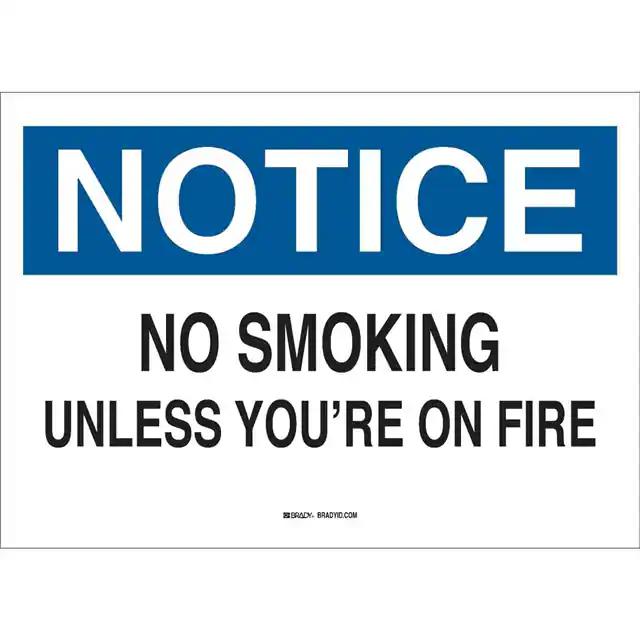 This is manufactured by Brady Corporation. The manufacturer part number is 38065. Label with a size of 10.00" l x 7.00" w (254.0mm x 177.8mm). The product is rohs3 compliant. It is assigned with possible HTSUS value of 3926.90.9985. It is shipped in bulk. It has a classic black and blue legend, white background colour. The product brady®, is a highly preferred choice for users. The product is made from highly stable and reliable polyester. In addition, it is reach unaffected. Its typical moisture sensitivity level is not applicable. A bespoke label is a notice. no smoking unless you're on fire label. The product is suitable for use with fire. It has a long 4 weeks standard lead time. The product is designated with the ear99 code number
