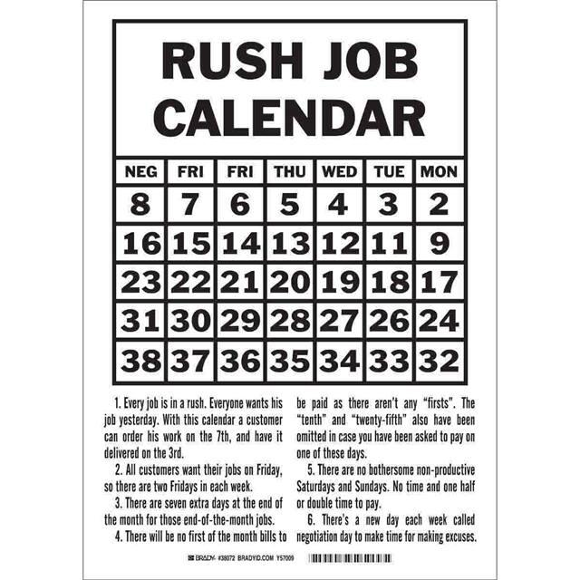 This is manufactured by Brady Corporation. The manufacturer part number is 38072. Label with a size of 14.00" l x 10.00" w (355.6mm x 254.0mm). The product is rohs3 compliant. It is assigned with possible HTSUS value of 3926.90.9985. It is shipped in bulk. It has a classic black legend, white background colour. The product brady®, is a highly preferred choice for users. The product is made from highly stable and reliable polyester. In addition, it is reach unaffected. Its typical moisture sensitivity level is not applicable. A bespoke label is a rush job calendar.1. every job is in a rush label. The product is suitable for use with notice. It has a long 4 weeks standard lead time. The product is designated with the ear99 code number