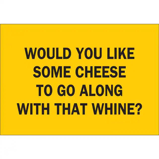 This is manufactured by Brady Corporation. The manufacturer part number is 38087. Label with a size of 10.00" l x 7.00" w (254.0mm x 177.8mm). The product is rohs3 compliant. It is assigned with possible HTSUS value of 3926.90.9985. It is shipped in bulk. It has a classic black legend, yellow background colour. The product brady®, is a highly preferred choice for users. The product is made from highly stable and reliable polyester. In addition, it is reach unaffected. Its typical moisture sensitivity level is not applicable. A bespoke label is a would you like some cheese to go along with that whine? label. The product is suitable for use with notice. It has a long 4 weeks standard lead time. The product is designated with the ear99 code number