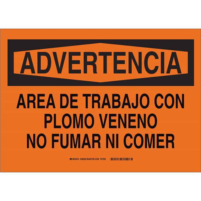This is manufactured by Brady Corporation. The manufacturer part number is 38286. Label with a size of 10.00" l x 7.00" w (254.0mm x 177.8mm). The product is rohs3 compliant. It is assigned with possible HTSUS value of 8310.00.0000. It is shipped in bulk. It has a classic black legend, orange background colour. The product brady®, is a highly preferred choice for users. The product is made from highly stable and reliable aluminum. In addition, it is reach unaffected. Its typical moisture sensitivity level is not applicable. A bespoke label is a advertencia. area de trabajo con plomo veneno no fumar ni comer label. The product is suitable for use with warning. It has a long 4 weeks standard lead time. The product is designated with the ear99 code number