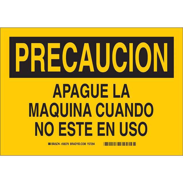 This is manufactured by Brady Corporation. The manufacturer part number is 38379. Label with a size of 10.00" l x 7.00" w (254.0mm x 177.8mm). The product is not applicable. It is assigned with possible HTSUS value of 8310.00.0000. It is shipped in bulk. It has a classic black legend, yellow background colour. The product brady®, is a highly preferred choice for users. The product is made from highly stable and reliable aluminum. In addition, it is reach affected. Its typical moisture sensitivity level is not applicable. A bespoke label is a precaucion. apague la maquina cuando no este en uso label. The product is suitable for use with caution. It has a long 4 weeks standard lead time. The product is designated with the ear99 code number