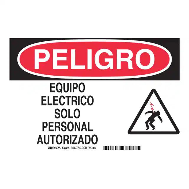 This is manufactured by Brady Corporation. The manufacturer part number is 38455. Label with a size of 10.00" l x 7.00" w (254.0mm x 177.8mm). The product is rohs3 compliant. It is assigned with possible HTSUS value of 8310.00.0000. It is shipped in bulk. It has a classic black and red legend, white background colour. The product brady®, is a highly preferred choice for users. The product is made from highly stable and reliable aluminum. In addition, it is reach unaffected. Its typical moisture sensitivity level is not applicable. A bespoke label is a peligro. equipo electrico solo personal autorizado label. The product is suitable for use with danger. It has a long 4 weeks standard lead time. The product is designated with the ear99 code number