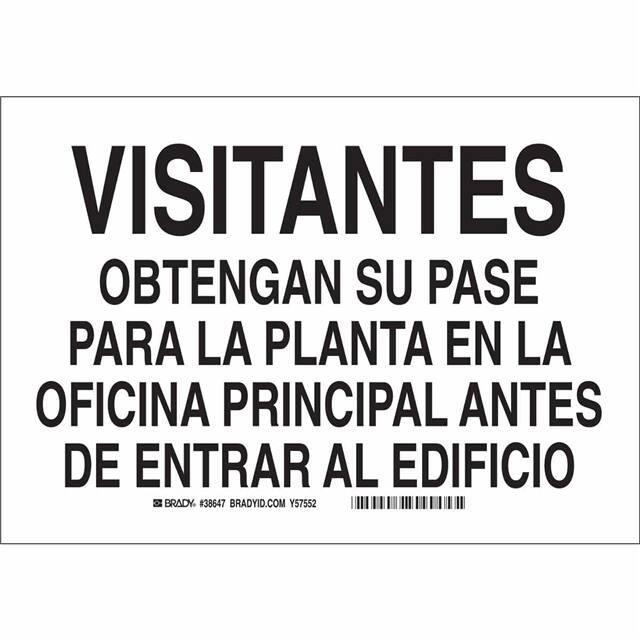 This is manufactured by Brady Corporation. The manufacturer part number is 38647. Label with a size of 10.00" l x 7.00" w (254.0mm x 177.8mm). The product is rohs3 compliant. It is assigned with possible HTSUS value of 3926.90.9985. It is shipped in bulk. It has a classic black legend, white background colour. The product brady®, is a highly preferred choice for users. The product is made from highly stable and reliable polyester. In addition, it is reach unaffected. Its typical moisture sensitivity level is not applicable. A bespoke label is a visitantes obtengan su pase para la planta en la oficina principal antes de entrar al edificio label. The product is suitable for use with warning. It has a long 4 weeks standard lead time. The product is designated with the ear99 code number