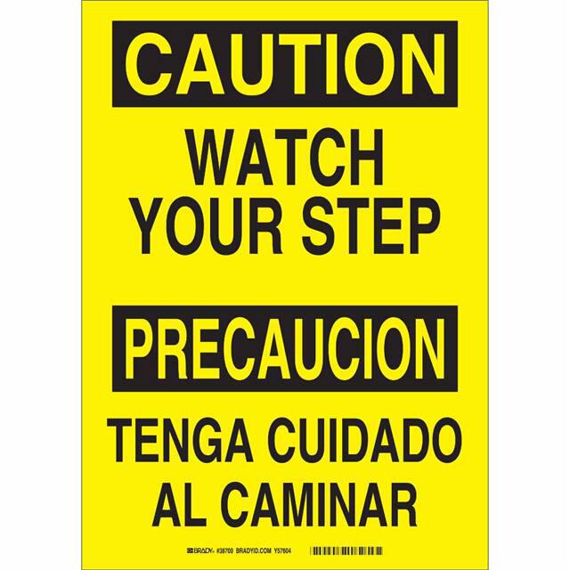 This is manufactured by Brady Corporation. The manufacturer part number is 38700. Label with a size of 14.00" l x 10.00" w (355.6mm x 254.0mm). The product is rohs3 compliant. It is assigned with possible HTSUS value of 3926.90.9985. It is shipped in bulk. It has a classic black legend, yellow background colour. The product brady®, is a highly preferred choice for users. The product is made from highly stable and reliable polyester. In addition, it is reach unaffected. Its typical moisture sensitivity level is not applicable. A bespoke label is a caution/precaucion. watch your step/tenga cuidado al caminar label. The product is suitable for use with caution. It has a long 4 weeks standard lead time. The product is designated with the ear99 code number