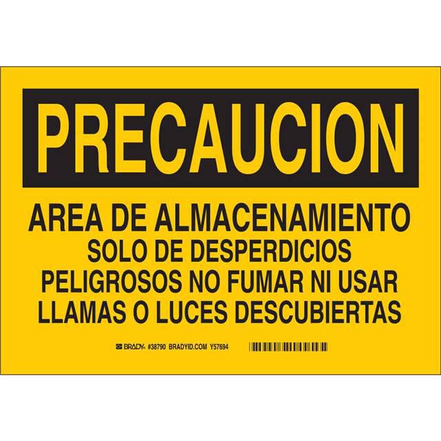 This is manufactured by Brady Corporation. The manufacturer part number is 38790. Label with a size of 14.00" l x 10.00" w (355.6mm x 254.0mm). The product is rohs3 compliant. It is assigned with possible HTSUS value of 3926.90.9985. It is shipped in bulk. It has a classic black legend, yellow background colour. The product brady®, is a highly preferred choice for users. The product is made from highly stable and reliable polyester. In addition, it is reach unaffected. Its typical moisture sensitivity level is not applicable. A bespoke label is a precaucion. area de almacenamiento solo de desperdicios peligrosos no fumar ni usar llamas o luces descubiertas label. The product is suitable for use with caution. It has a long 4 weeks standard lead time. The product is designated with the ear99 code number