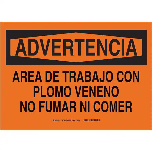 This is manufactured by Brady Corporation. The manufacturer part number is 38792. Label with a size of 14.00" l x 10.00" w (355.6mm x 254.0mm). The product is rohs3 compliant. It is assigned with possible HTSUS value of 3926.90.9985. It is shipped in bulk. It has a classic black legend, orange background colour. The product brady®, is a highly preferred choice for users. The product is made from highly stable and reliable polyester. In addition, it is reach unaffected. Its typical moisture sensitivity level is not applicable. A bespoke label is a advertencia. area de trabajo con plomo veneno no fumar ni comer label. It has a long 4 weeks standard lead time. The product is designated with the ear99 code number