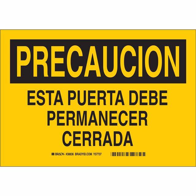 This is manufactured by Brady Corporation. The manufacturer part number is 38836. Label with a size of 14.00" l x 10.00" w (355.6mm x 254.0mm). The product is rohs3 compliant. It is assigned with possible HTSUS value of 3926.90.9985. It is shipped in bulk. It has a classic black legend, yellow background colour. The product brady®, is a highly preferred choice for users. The product is made from highly stable and reliable polyester. In addition, it is reach unaffected. Its typical moisture sensitivity level is not applicable. A bespoke label is a precaucion. esta puerta debe permanecer cerrada label. The product is suitable for use with caution. It has a long 4 weeks standard lead time. The product is designated with the ear99 code number