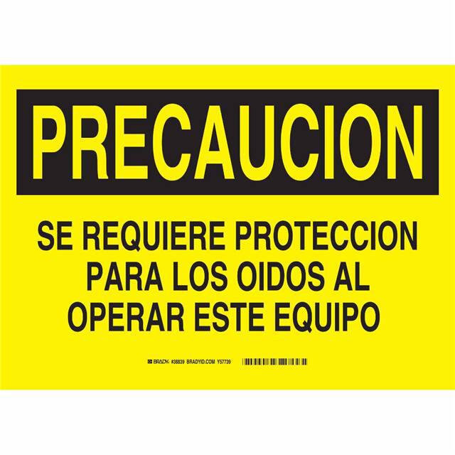This is manufactured by Brady Corporation. The manufacturer part number is 38839. Label with a size of 14.00" l x 10.00" w (355.6mm x 254.0mm). The product is rohs3 compliant. It is assigned with possible HTSUS value of 3926.90.9985. It is shipped in bulk. It has a classic black legend, yellow background colour. The product brady®, is a highly preferred choice for users. The product is made from highly stable and reliable polyester. In addition, it is reach unaffected. Its typical moisture sensitivity level is not applicable. A bespoke label is a precaucion. se requiere proteccion para los oidos al operar este equipo label. The product is suitable for use with caution. It has a long 4 weeks standard lead time. The product is designated with the ear99 code number